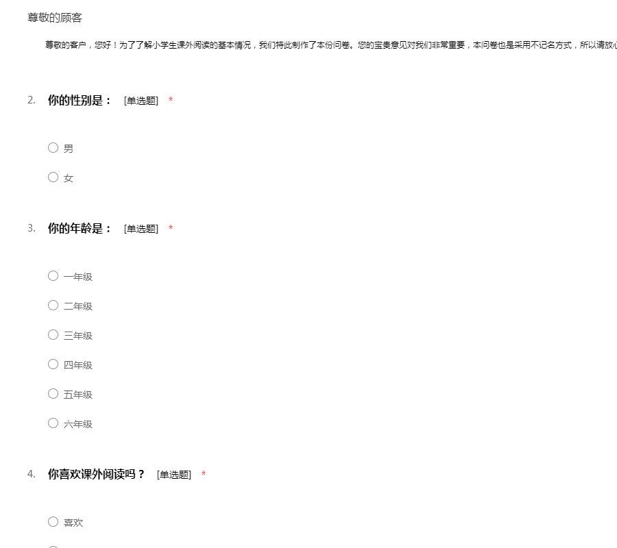 ——尊敬的客户,您好!为了了解小学生课外阅读的基本情况,我们特此制作了本份问卷。您的宝贵意见对我们非常重要,本问卷也是采用不记名方式,所以请放心的如实填写。感谢您的支持与配合!