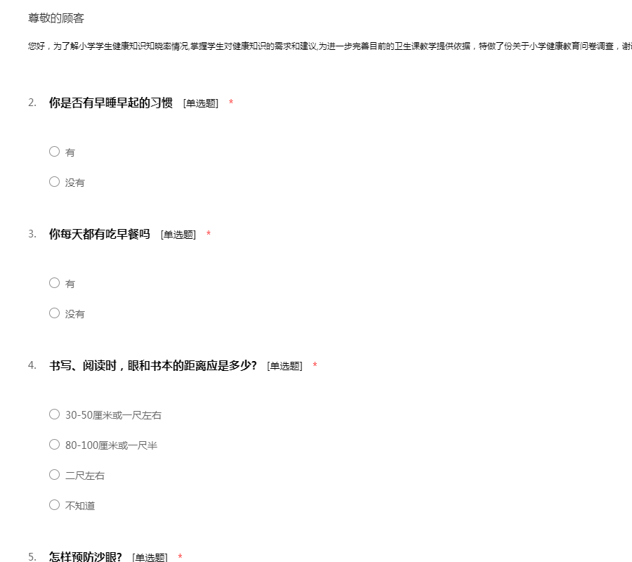 您好,为了解小学学生健康知识知晓率情况,掌握学生对健康知识的需求和建议,为进一步完善目前的卫生课教学提供依据,特做了份关于小学健康教育问卷调查,谢谢你的回答。