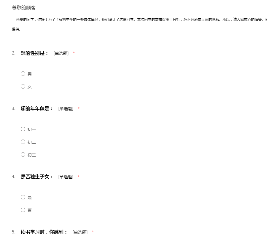 亲爱的同学,你好!为了了解初中生的一些具体情况,我们设计了这份问卷。本次问卷的数据仅用于分析,绝不会透露大家的隐私。所以,请大家放心的填答。感谢你的支持与合作!初中学生问卷由51调查网提供。