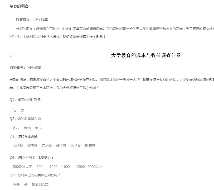 问卷概况: 14个问题 亲爱的朋友:感谢您在百忙之中抽出时间填写这份调查问卷。我们设计的是一份关于大学生教育投资与收益的问卷,为了更好的解决您在教育投资和收益中的问题,请如实的填写问卷。(此问卷只用于学术研究,我们会做好保密工作)谢谢!
