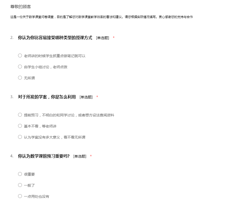 这是一份关于数学课堂问卷调查,目的是了解您对数学课堂教学效率的看法和建议。请您根据实际情况填写。衷心感谢您的支持与合作