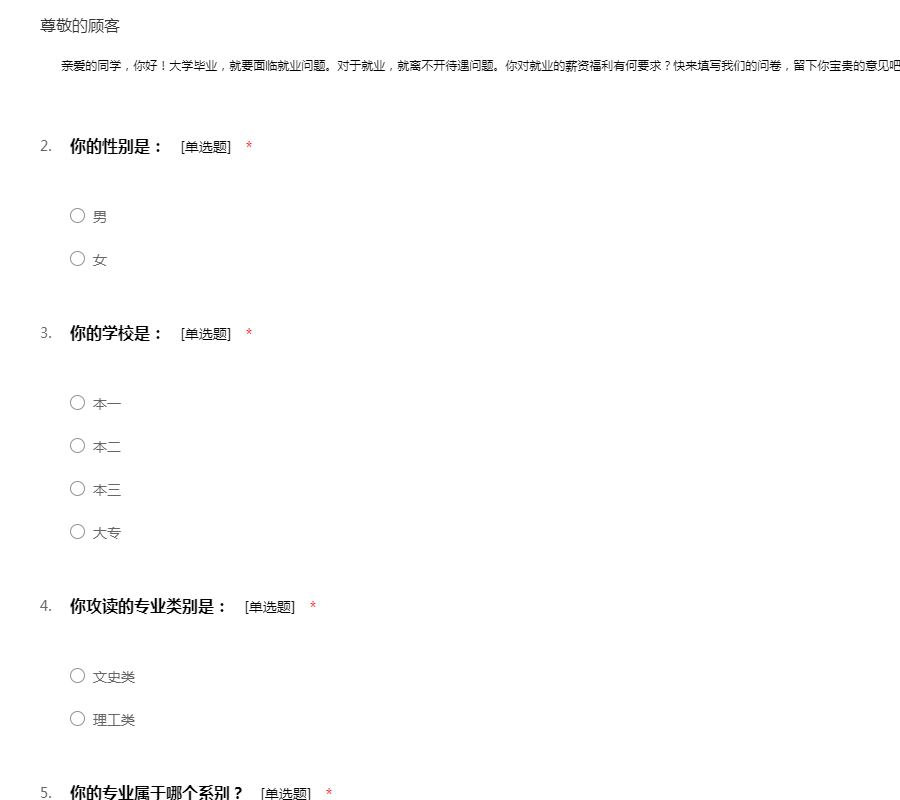 亲爱的同学,你好!大学毕业,就要面临就业问题。对于就业,就离不开待遇问题。你对就业的薪资福利有何要求?快来填写我们的问卷,留下你宝贵的意见吧!感谢你的支持!