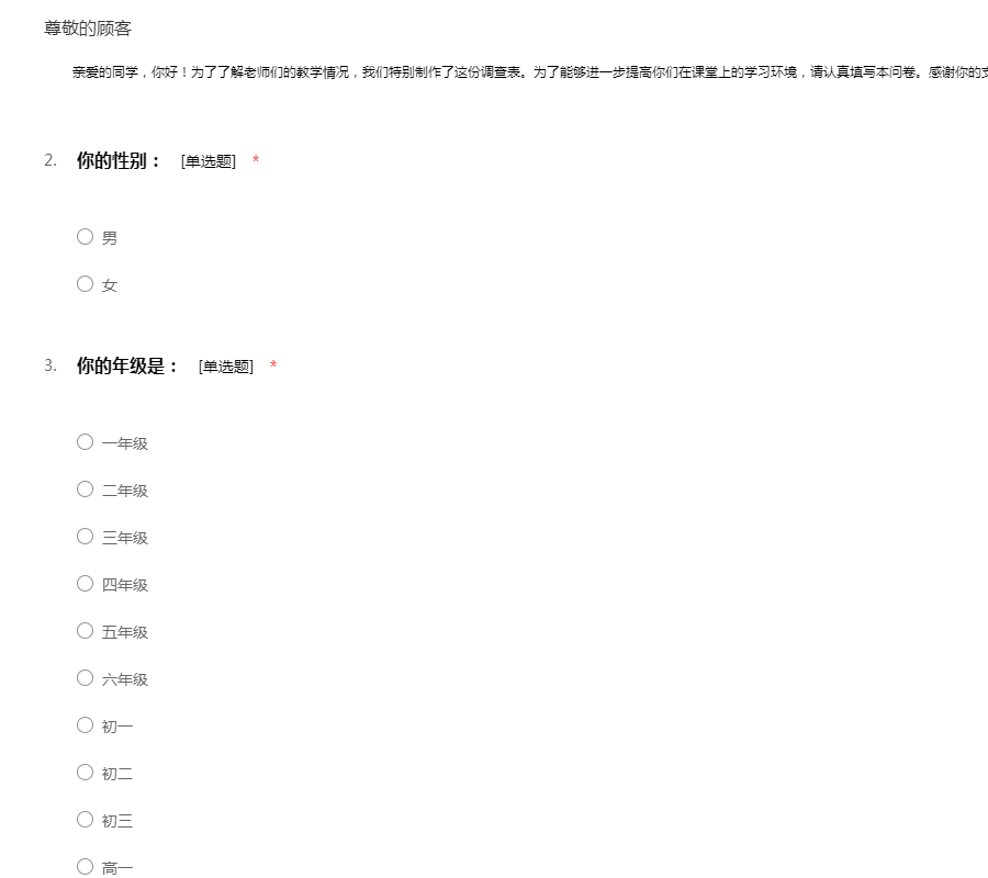——亲爱的同学,你好!为了了解老师们的教学情况,我们特别制作了这份调查表。为了能够进一步提高你们在课堂上的学习环境,请认真填写本问卷。感谢你的支持!