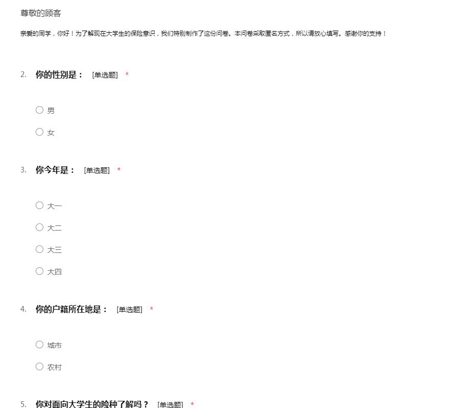 亲爱的同学,你好!为了解现在大学生的保险意识,我们特别制作了这份问卷。本问卷采取匿名方式,所以请放心填写。感谢你的支持!