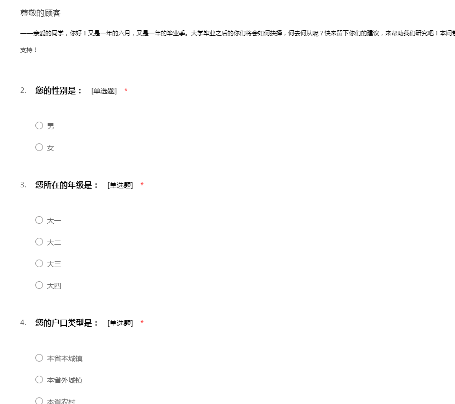 ——亲爱的同学,你好!又是一年的六月,又是一年的毕业季。大学毕业之后的你们将会如何抉择,何去何从呢?快来留下你们的建议,来帮助我们研究吧!本问卷采取不记名方式,所以请放心填写哦!感谢你的支持!