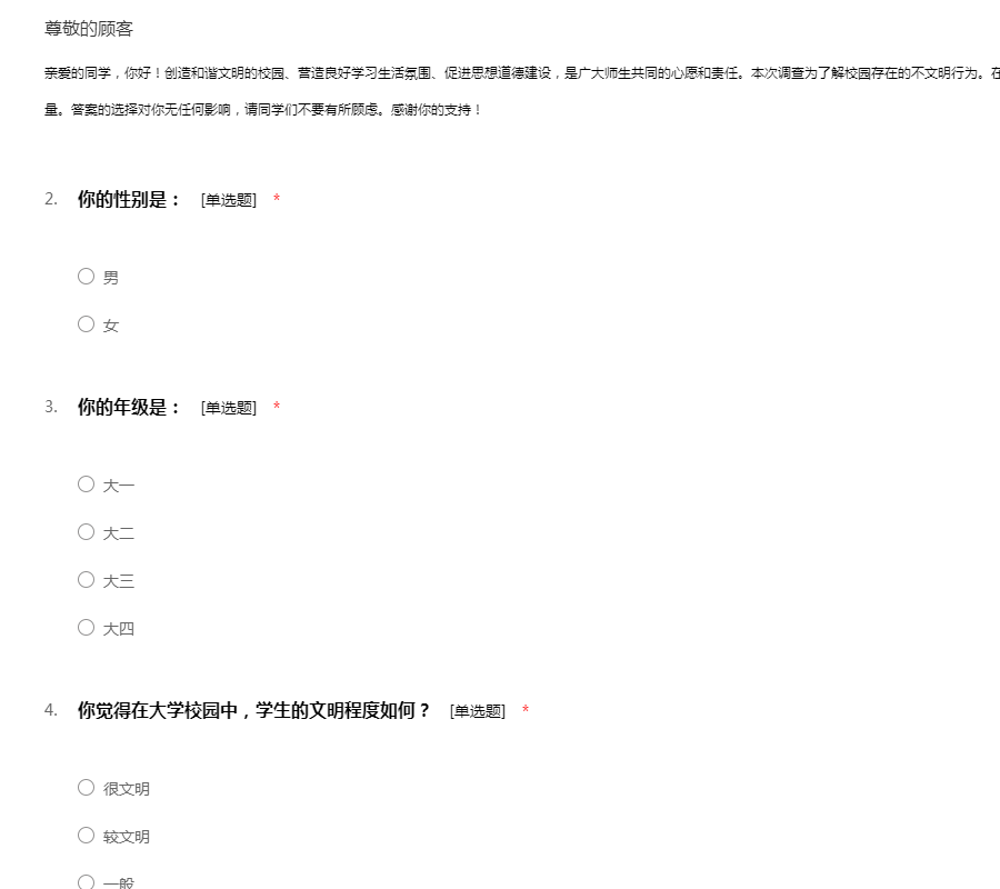 亲爱的同学,你好!创造和谐文明的校园、营造良好学习生活氛围、促进思想道德建设,是广大师生共同的心愿和责任。本次调查为了解校园存在的不文明行为。在完成问卷的同时,为学校的文明建设贡献一份力量。答案的选择对你无任何影响,请同学们不要有所顾虑。感谢你的支持!