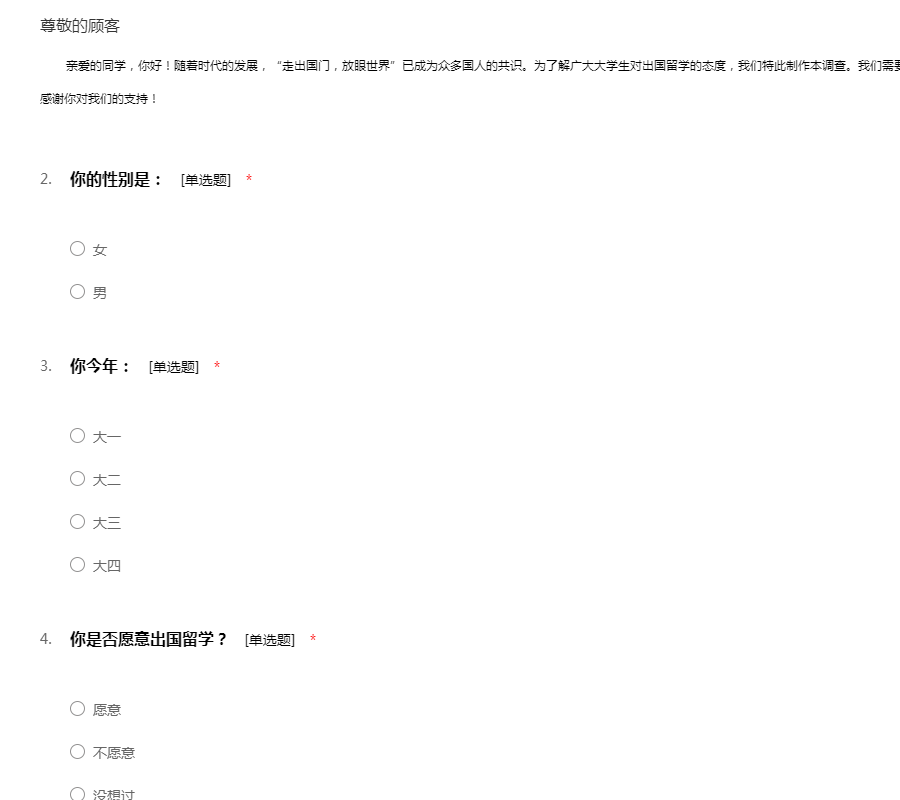 ——亲爱的同学,你好!随着时代的发展,“走出国门,放眼世界”已成为众多国人的共识。为了解广大大学生对出国留学的态度,我们特此制作本调查。我们需要占用你的一些宝贵时间,请根据实际情况填写。感谢你对我们的支持!
