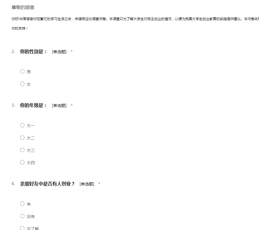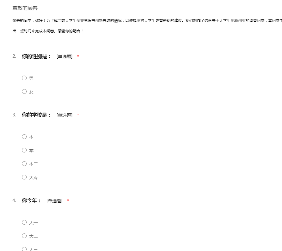 亲爱的同学,你好!为了解当前大学生创业意识与创新思维的情况,以便提出对大学生更有帮助的建议。我们制作了这份关于大学生创新创业的调查问卷,本问卷主要面对在校大学生或刚毕业大学生,希望你能抽出一点时间来完成本问卷。感谢你的配合!