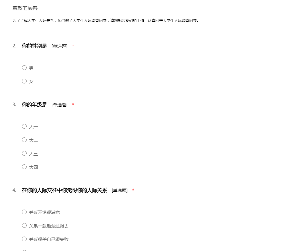 为了了解大学生人际关系,我们做了大学生人际调查问卷,请您配合我们的工作,认真回答大学生人际调查问卷。