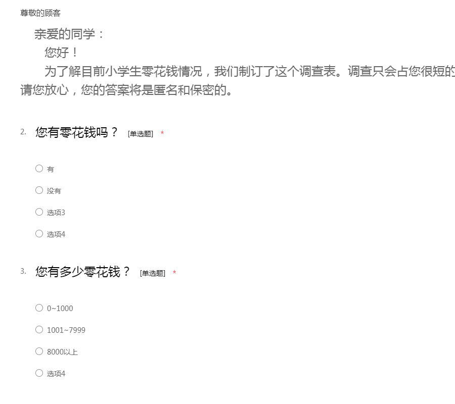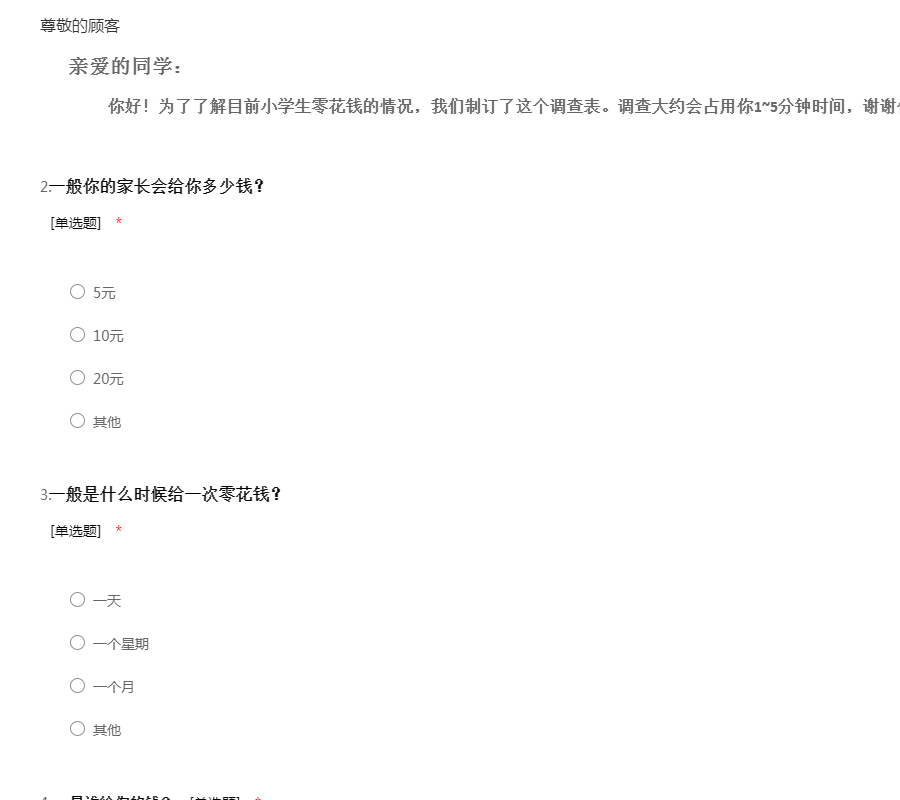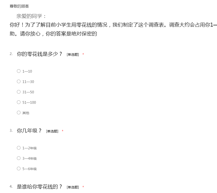 亲爱的同学: 你好!为了了解目前小学生零花钱的情况,我们制订了这个调查表。调查大约会占用你1~5分钟时间,谢谢你帮助。