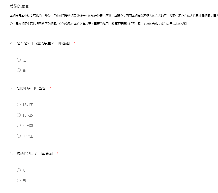 本问卷是毕业论文写作的一部分,我们对问卷数据只做综合性的统计处理,不做个案研究,因而本问卷以不记名的方式填写,故而也不存在私人信息泄露问题,请大家可以放心填写。这份问卷的答案没有对错之分,请您根据实际情况回答下列问题。你的意见对本论文有着至关重要的作用,敬请不要漏答任何一题。对您的合作,我们表示衷心的感谢