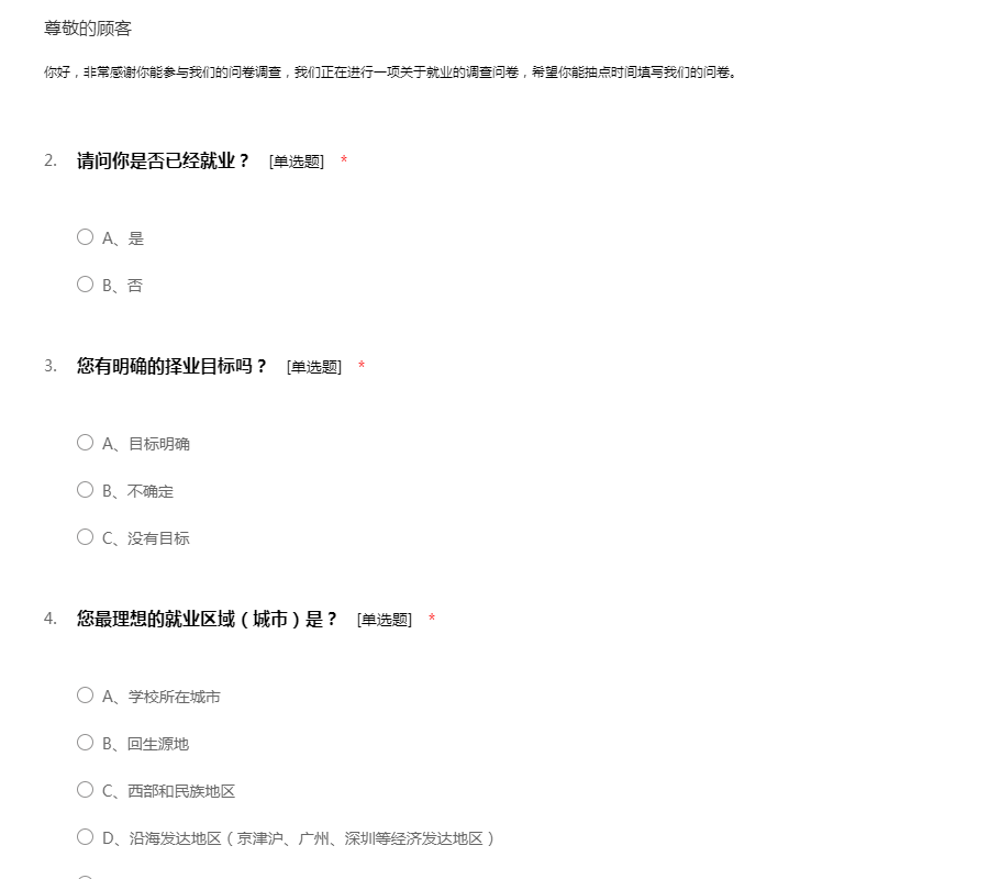 你好,非常感谢你能参与我们的问卷调查,我们正在进行一项关于就业的调查问卷,希望你能抽点时间填写我们的问卷。