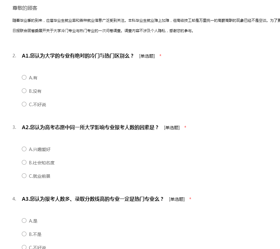 随着毕业季的到来,应届毕业生就业率和各种就业信息广泛受到关注。本科毕业生就业难上加难,但高级技工却是万里挑一的高薪高酬的现象已经不是空谈。为了更好地引导广大青年清楚的认识到当今现状,湖北日报联合团省委展开关于大学冷门专业与热门专业的一次问卷调查。调查内容不涉及个人隐私,感谢您的参与。