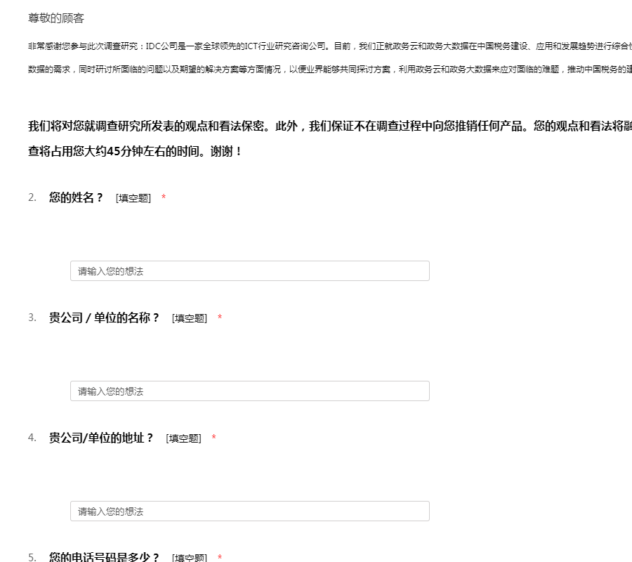 非常感谢您参与此次调查研究:IDC公司是一家全球领先的ICT行业研究咨询公司。目前,我们正就政务云和政务大数据在中国税务建设、应用和发展趋势进行综合性的调查研究,以便了解税务对政务云和政务大数据的需求,同时研讨所面临的问题以及期望的解决方案等方面情况,以便业界能够共同探讨方案,利用政务云和政务大数据来应对面临的难题,推动中国税务的建设和发展。