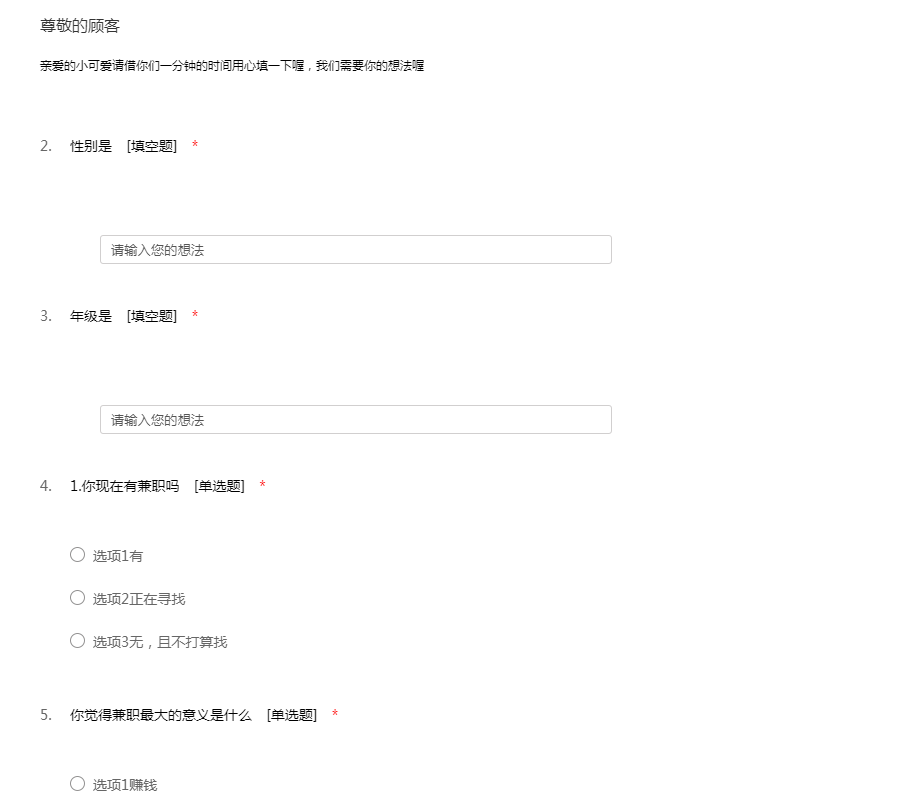 该问卷面向广大需要找兼职工作的朋友,用于收集你们对这样一个提供兼职工作平台的意见。这些意见将会注入我们未来的兼职工作平台中。