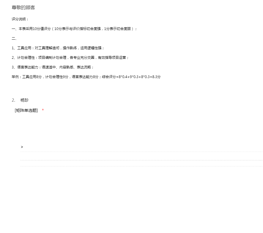 评分说明:一、本表采用10分值评分(10分表示与评价指标切合度强,1分表示切合度弱);二、1、工具应用:对工具理解透彻,操作熟练,运用逻辑性强;2、计划合理性:项目编制计划合理,各专业充分交圈,有效指导项目运营;3、语言表达能力:语速适中、内容熟悉、表达流畅;举例:工具应用8分,计划合理性9分,语言表达能力8分;综合评分=8*0.4+9*0.3+8*0.3=8.3分