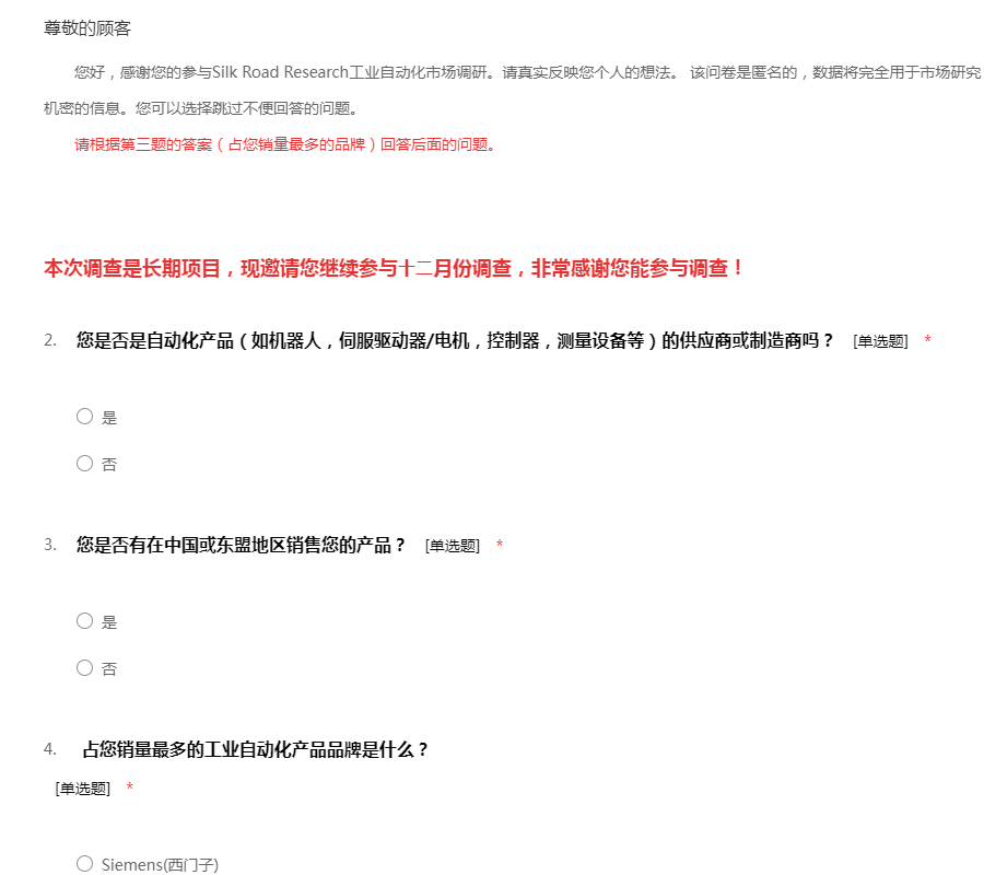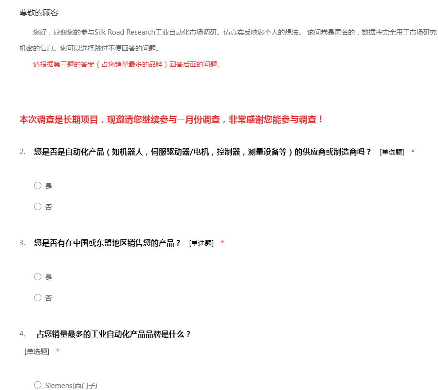 您好,感谢您的参与Silk Road Research工业自动化市场调研。请真实反映您个人的想法。 该问卷是匿名的,数据将完全用于市场研究,并得到严格保密。请勿泄露任何敏感或机密的信息。您可以选择跳过不便回答的问题。 请根据第三题的答案(占您销量最多的品牌)回答后面的问题。