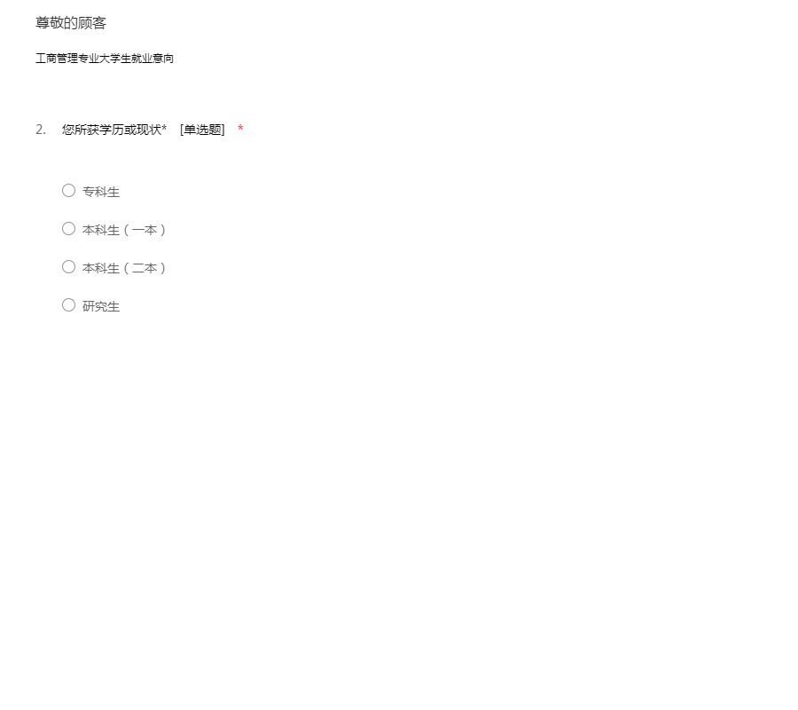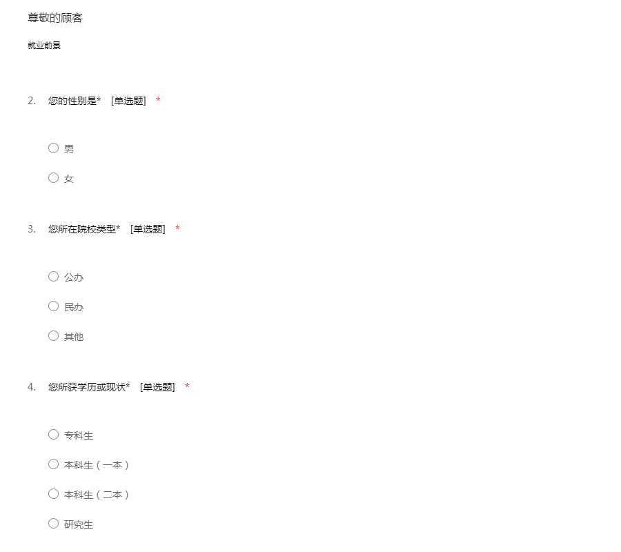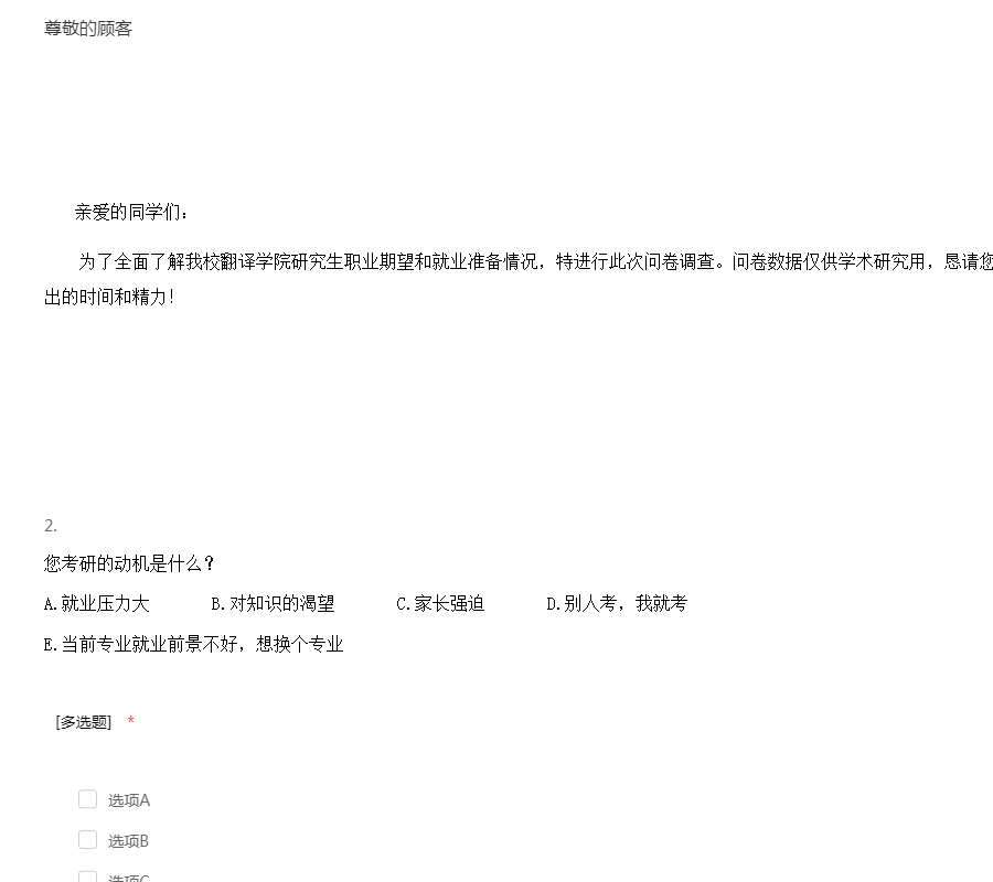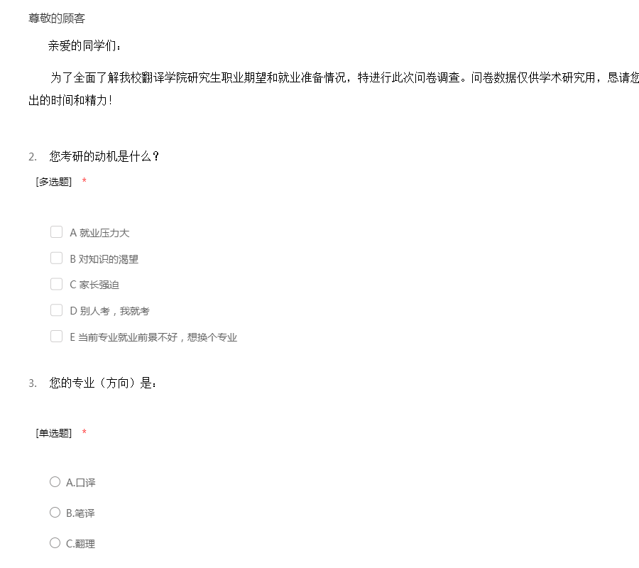 亲爱的同学们: 为了全面了解我校翻译学院研究生职业期望和就业准备情况,特进行此次问卷调查。问卷数据仅供学术研究用,恳请您如实填写问卷,衷心感谢您为此付出的时间和精力!