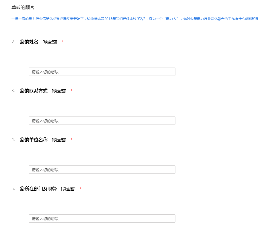 一年一度的电力行业信息化成果评选又要开始了,这也标志着2015年我们已经走过了2/3,身为一个“电力人”,你对今年电力行业两化融合的工作有什么问题和建议吗?请如实填写下表~