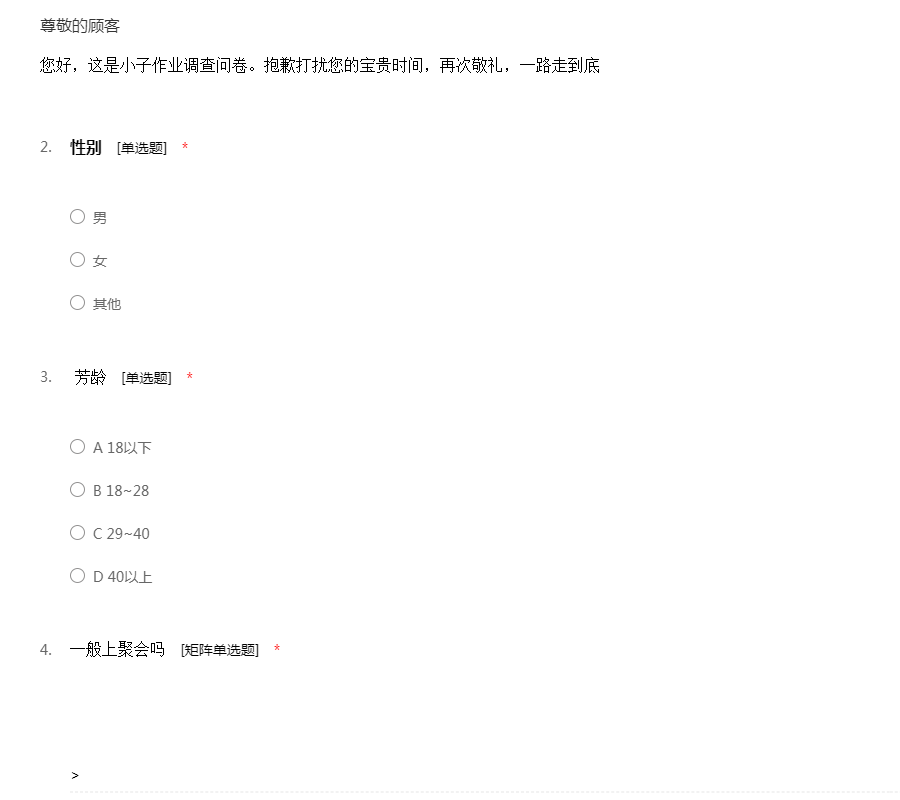 您好,这是小子作业调查问卷。抱歉打扰您的宝贵时间,再次敬礼,一路走到底
