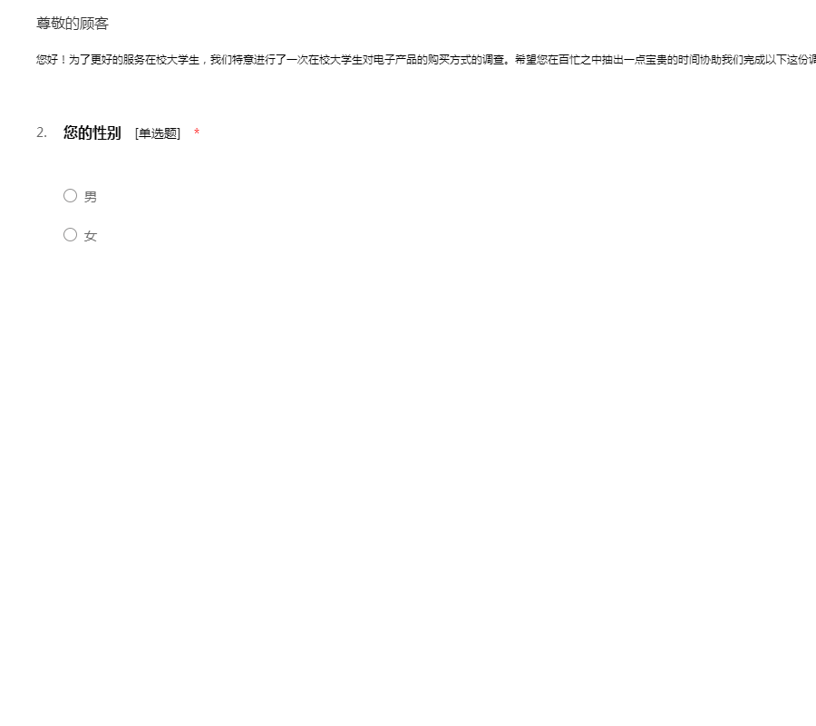 您好!为了更好的服务在校大学生,我们特意进行了一次在校大学生对电子产品的购买方式的调查。希望您在百忙之中抽出一点宝贵的时间协助我们完成以下这份调查问卷。谢谢您的合作!