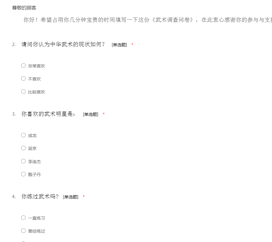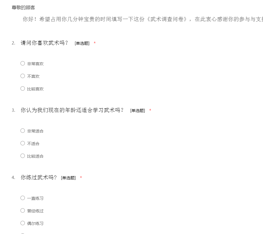 你好!希望占用你几分钟宝贵的时间填写一下这份《武术调查问卷》,在此衷心感谢你的参与与支持。