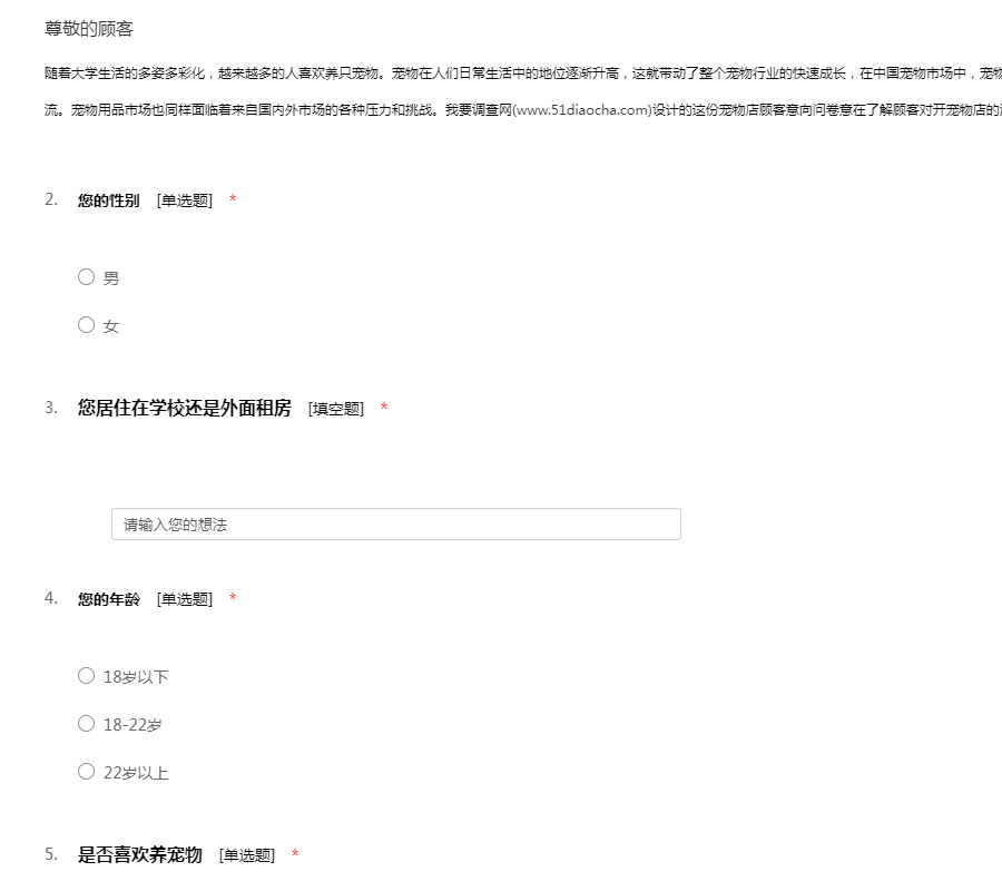随着大学生活的多姿多彩化,越来越多的人喜欢养只宠物。宠物在人们日常生活中的地位逐渐升高,这就带动了整个宠物行业的快速成长,在中国宠物市场中,宠物用品和宠物服装已经成为社会中的一股时尚潮流。宠物用品市场也同样面临着来自国内外市场的各种压力和挑战。我要调查网(www.51diaocha.com)设计的这份宠物店顾客意向问卷意在了解顾客对开宠物店的满意程度。