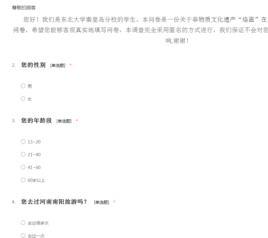您好!我们是东北大学秦皇岛分校的学生。本问卷是一份关于非物质文化遗产“烙画”在发源地河南南阳的现状调查问卷,希望您能够客观真实地填写问卷,本调查完全采用匿名的方式进行,我们保证不会对您的生活和工作带来负面的影响,谢谢!