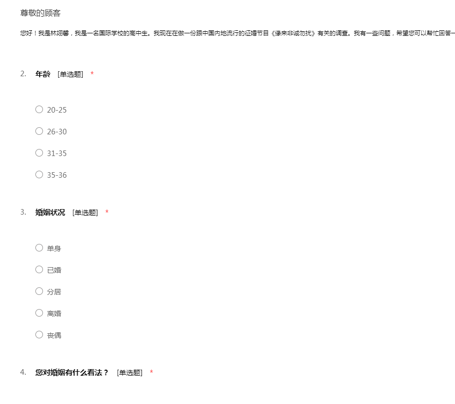 您好!我是林翊馨,我是一名国际学校的高中生。我现在在做一份跟中国内地流行的征婚节目《缘来非诚勿扰》有关的调查。我有一些问题,希望您可以帮忙回答一下。非常感谢您参与我们的调查。