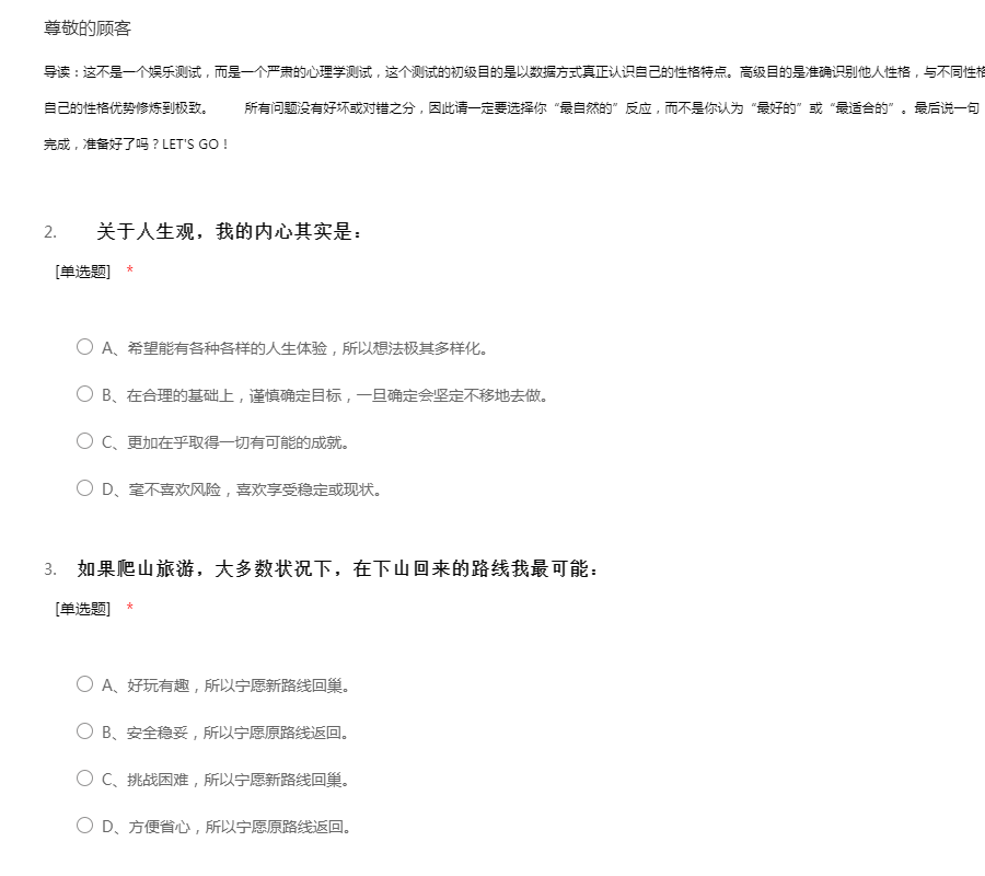 导读:这不是一个娱乐测试,而是一个严肃的心理学测试,这个测试的初级目的是以数据方式真正认识自己的性格特点。高级目的是准确识别他人性格,与不同性格交往的秘笈,了解自己性格本源的力量和如何将自己的性格优势修炼到极致。 所有问题没有好坏或对错之分,因此请一定要选择你“最自然的”反应,而不是你认为“最好的”或“最适合的”。最后说一句,题目略长,共30题,请分前后15题来做,耐心完成,准备好了吗?LET'S GO!