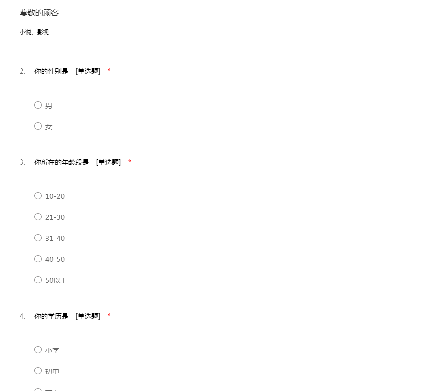 玄幻小说问卷是为了调查读者对玄幻小说的阅读习惯,我们保证不会泄露您的个人信息,请放心填写。51调查网(我要调查网)谢谢您的参与。