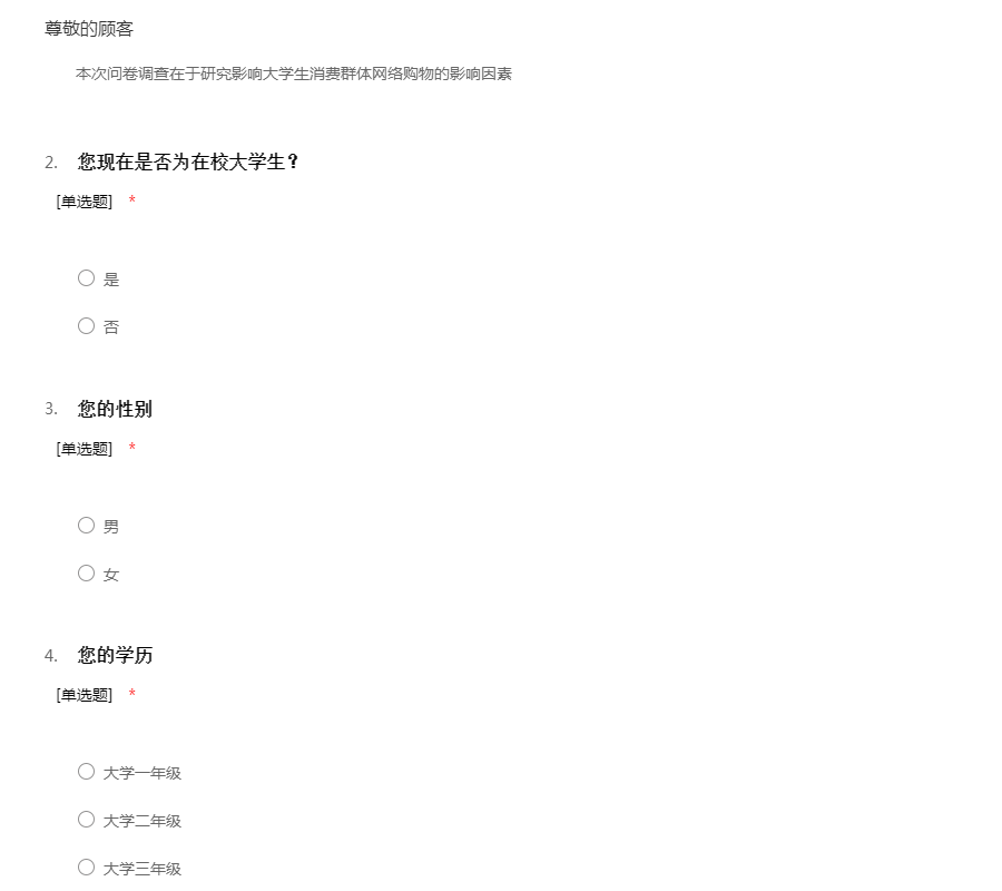 本次问卷调查在于研究影响大学生消费群体网络购物的影响因素