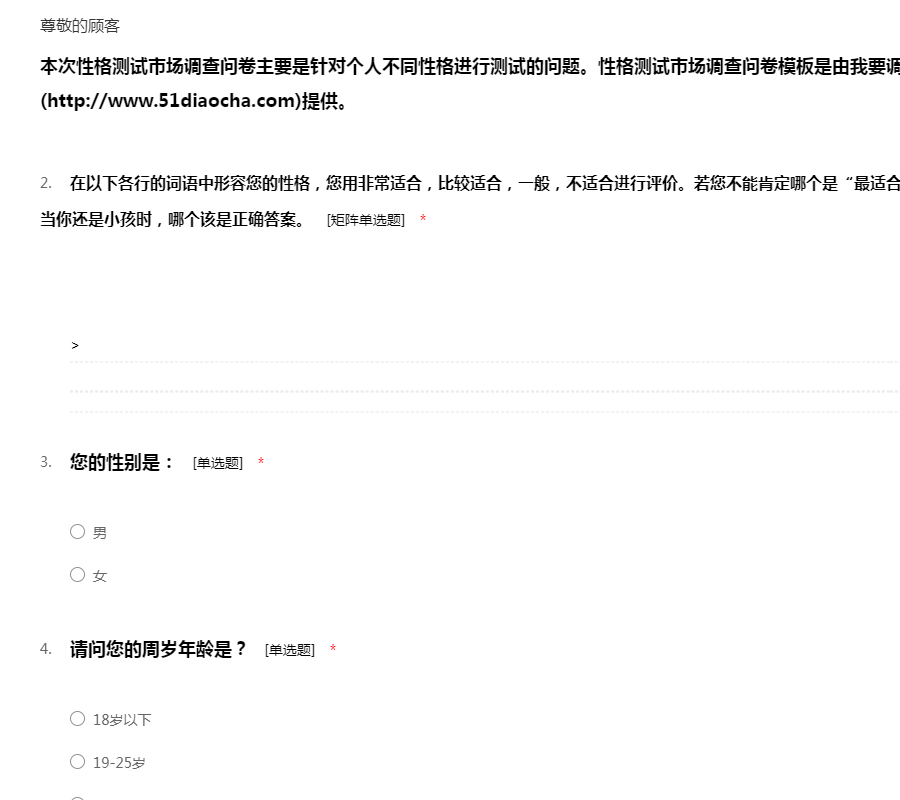 本次性格测试市场调查问卷主要是针对个人不同性格进行测试的问题。性格测试市场调查问卷模板是由我要调查网(http://www.51diaocha.com)提供。