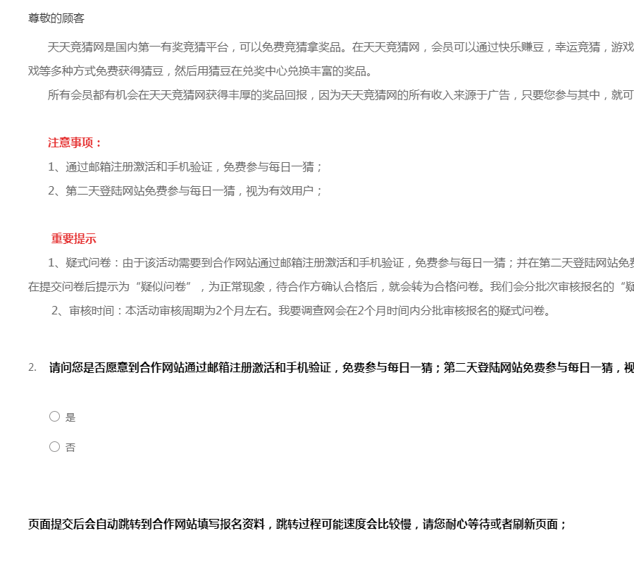 1、疑式问卷:由于该活动需要到合作网站通过邮箱注册激活和手机验证,免费参与每日一猜;并在第二天登陆网站免费参与每日一猜,视为有效用户;故在提交问卷后提示为“疑似问卷”,为正常现象,待合作方确认合格后,就会转为合格问卷。我们会分批次审核报名的“疑式问卷”。