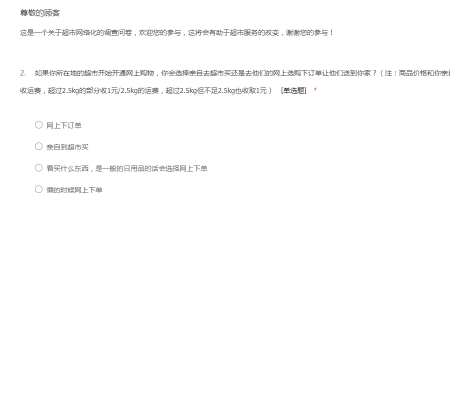 这是一个关于超市网络化的调查问卷,欢迎您的参与,这将会有助于超市服务的改变,谢谢您的参与!