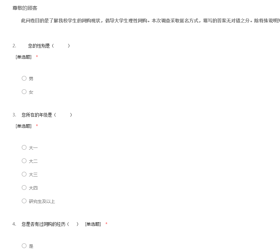此问卷目的是了解我校学生的网购现状,倡导大学生理性网购。本次调查采取匿名方式,填写的答案无对错之分。除特殊说明外,题目均为单选