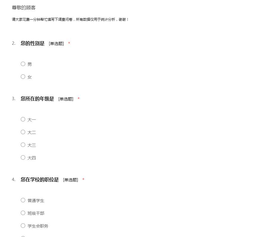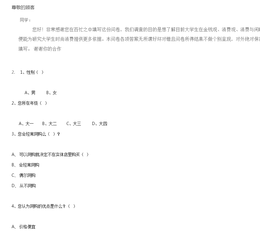 您好,我们是XXX,我们正在进行一项关于大学生网购的调查,想邀请您用几分钟时间帮忙填答这份问卷。本问卷实行匿名制,所有数据只用于统计分析, 请您放心填写。题目选项无对错之分,请您按自己的实际情况填写。谢谢您的帮助。