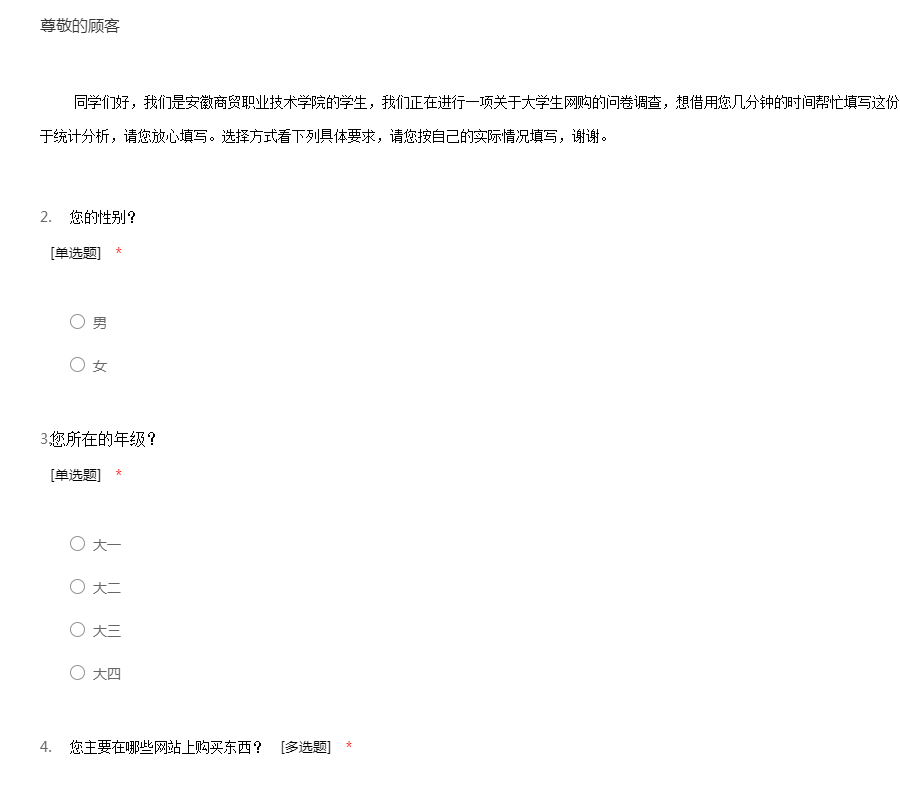 同学们好,我们是安徽商贸职业技术学院的学生,我们正在进行一项关于大学生网购的问卷调查,想借用您几分钟的时间帮忙填写这份问卷。本问卷实行匿名制,所有数据只用于统计分析,请您放心填写。选择方式看下列具体要求,请您按自己的实际情况填写,谢谢。