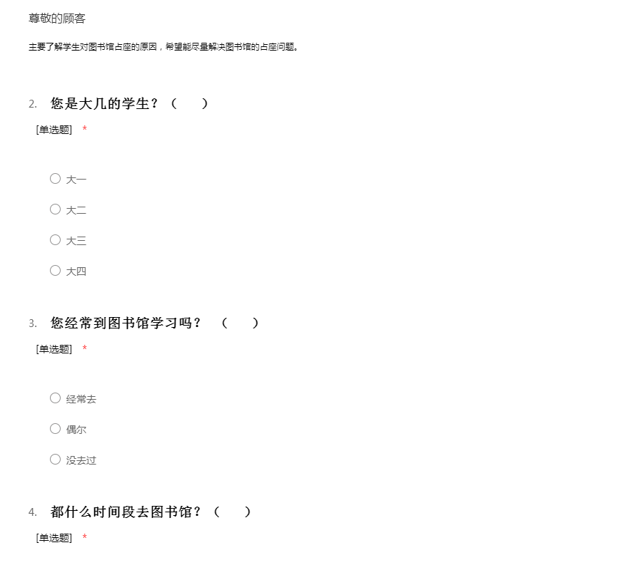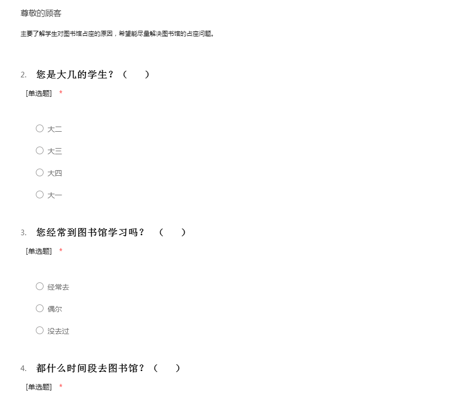 主要了解学生对图书馆占座的原因,希望能尽量解决图书馆的占座问题。