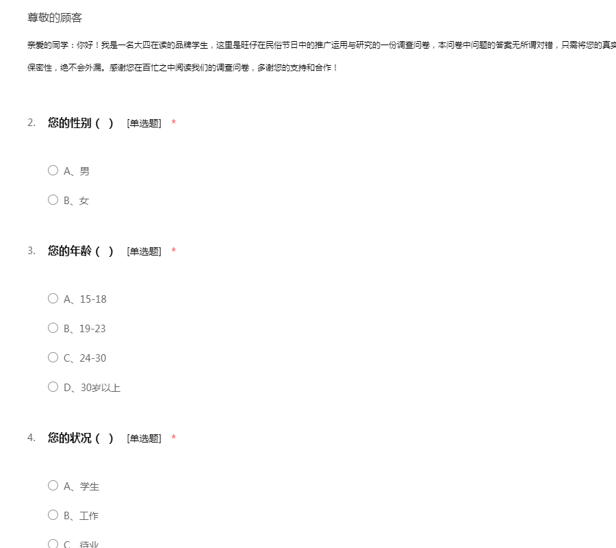 亲爱的同学:你好!我是一名大四在读的品牌学生,这里是旺仔在民俗节日中的推广运用与研究的一份调查问卷,本问卷中问题的答案无所谓对错,只需将您的真实情况和想法告诉我,我们也会保证您问卷答案的保密性,绝不会外漏。感谢您在百忙之中阅读我们的调查问卷,多谢您的支持和合作!