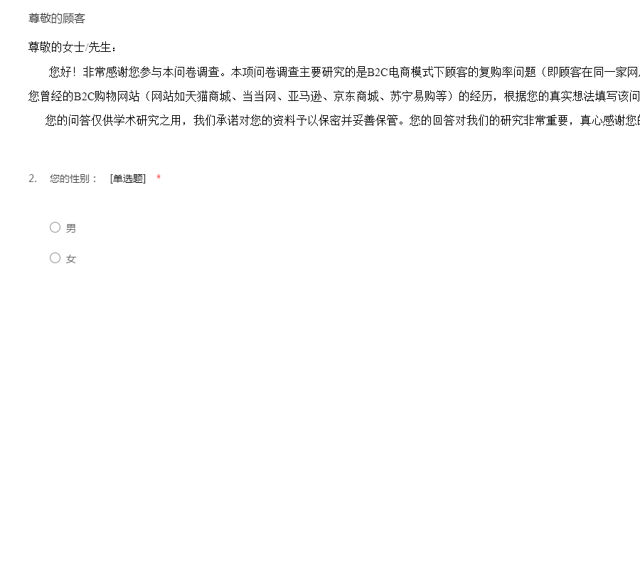 尊敬的女士/先生: 您好!非常感谢您参与本问卷调查。本项问卷调查主要研究的是B2C电商模式下顾客的复购率问题(即顾客在同一家网店的重复购买率问题)。希望您回忆您曾经的B2C购物网站(网站如天猫商城、当当网、亚马逊、京东商城、苏宁易购等)的经历,根据您的真实想法填写该问卷。 您的问答仅供学术研究之用,我们承诺对您的资料予以保密并妥善保管。您的回答对我们的研究非常重要,真心感谢您的参与和合作!