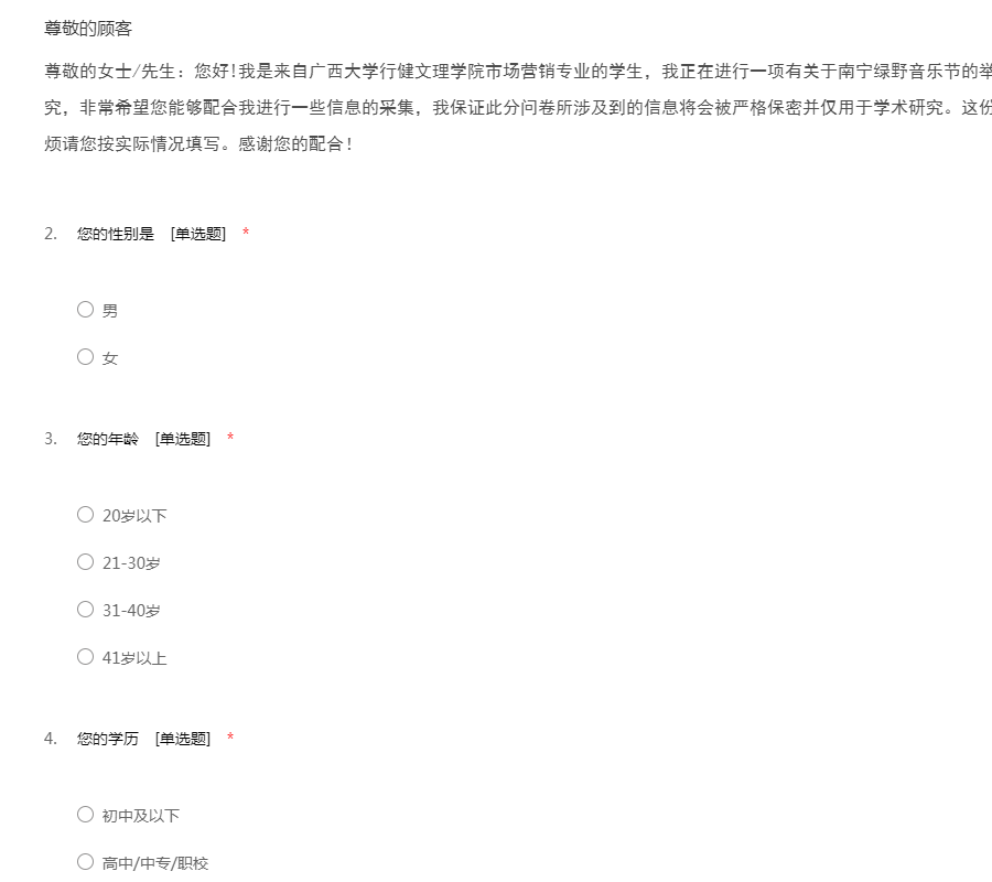 尊敬的女士/先生:您好!我是来自广西大学行健文理学院市场营销专业的学生,我正在进行一项有关于南宁绿野音乐节的举办对于南宁城市形象塑造的影响研究,非常希望您能够配合我进行一些信息的采集,我保证此分问卷所涉及到的信息将会被严格保密并仅用于学术研究。这份问卷大约会花费您3-5分钟的时间,烦请您按实际情况填写。感谢您的配合!