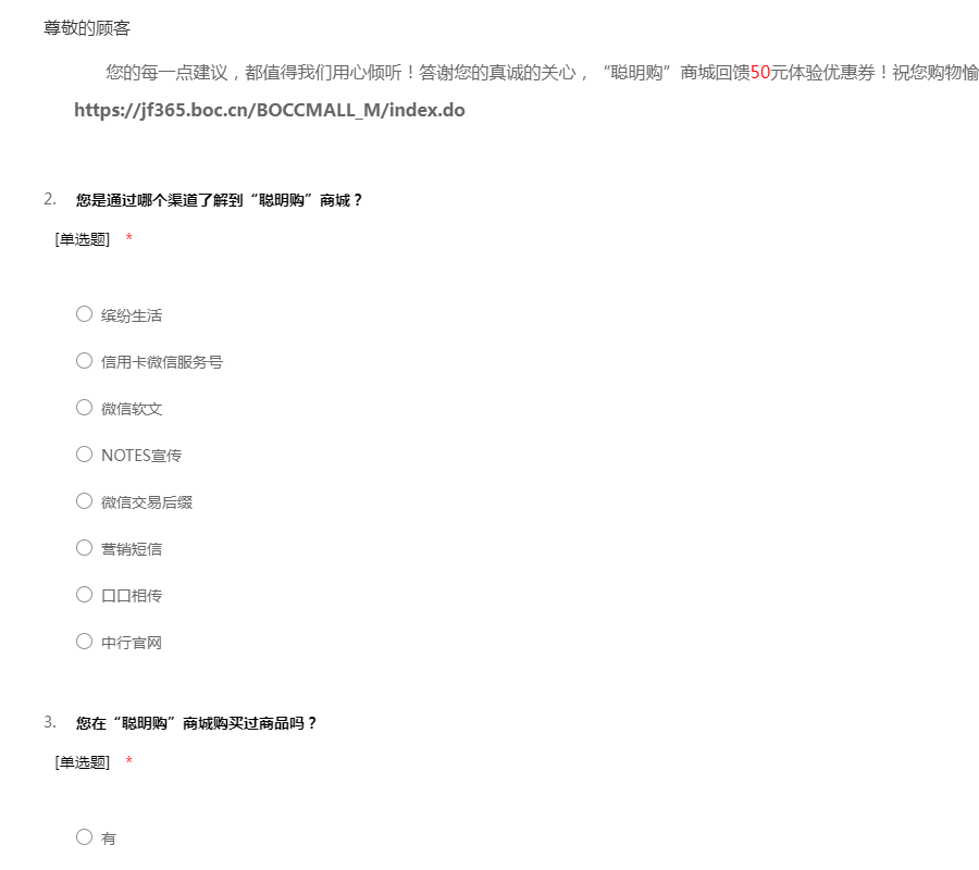您的每一点建议,都值得我们用心倾听!答谢您的真诚的关心,“聪明购”商城回馈50元体验优惠券!祝您购物愉快!复制链接进入“聪明购”商城! https://jf365.boc.cn/BOCCMALL_M/index.do