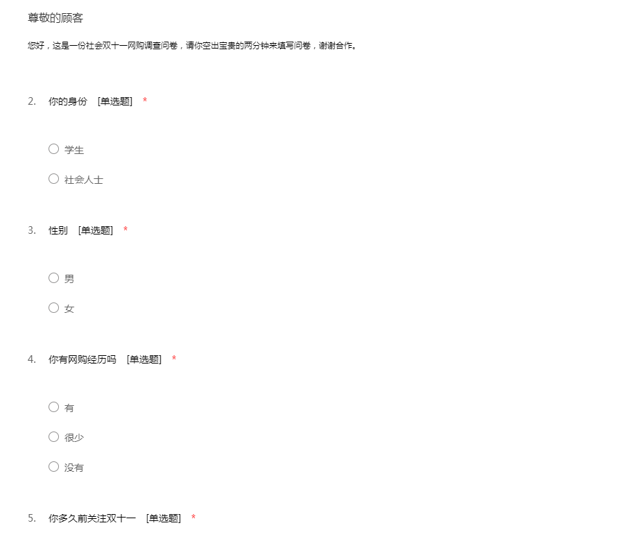 您好,这是一份社会双十一网购调查问卷,请你空出宝贵的两分钟来填写问卷,谢谢合作。