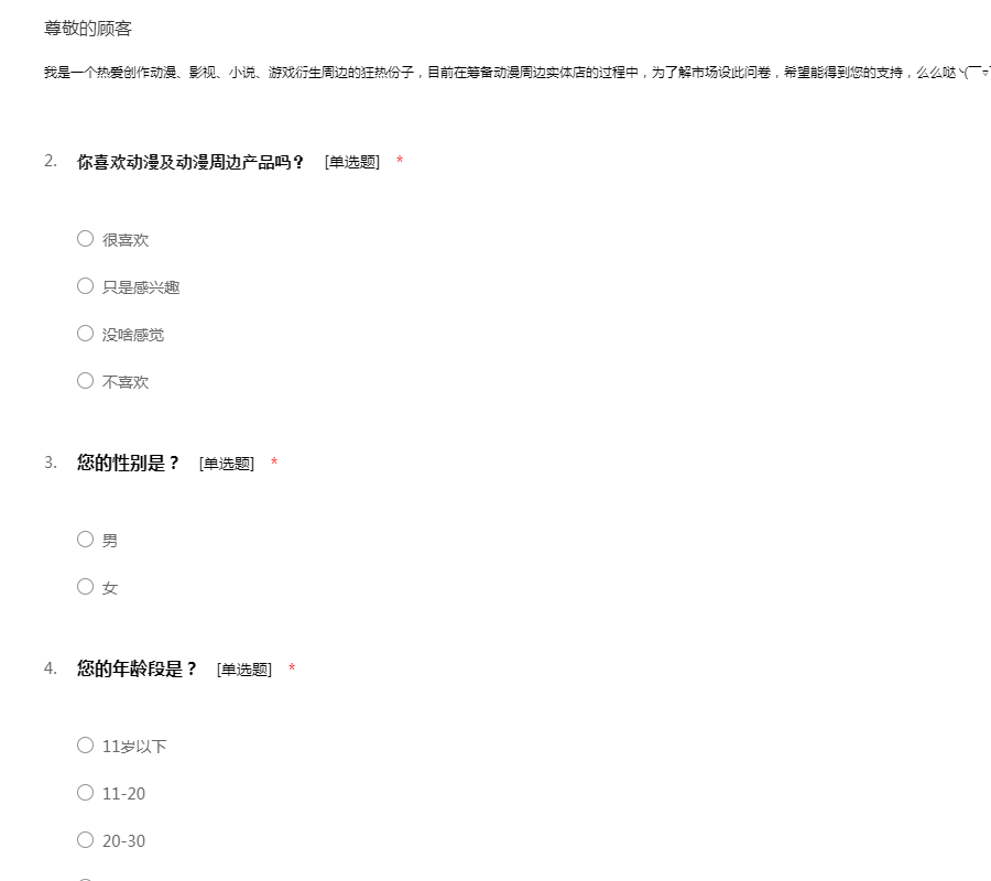 我是一个热爱创作动漫、影视、小说、游戏衍生周边的狂热份子,目前在筹备动漫周边实体店的过程中,为了解市场设此问卷,希望能得到您的支持,么么哒╰( ̄▽ ̄)╮