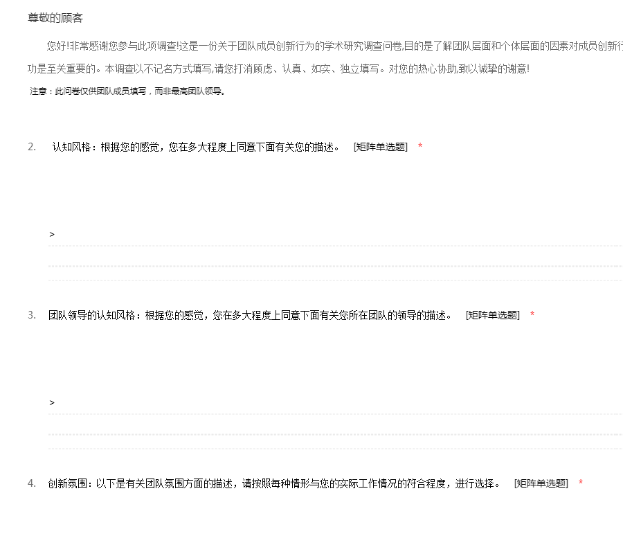 您好!真诚的感谢您能在百忙中抽出时间来接受我们的调查,帮助我们填这份问卷。您的回答将对我们的调查结果产生重要影响,请您务必认真做最真实的填写,我们会以无记名的方式对您进行绝对保密,请您尽管放心。