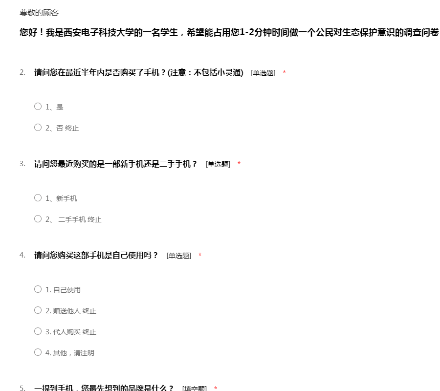 您好!我是西安电子科技大学的一名学生,希望能占用您1-2分钟时间做一个公民对生态保护意识的调查问卷,非常感谢您的参与!