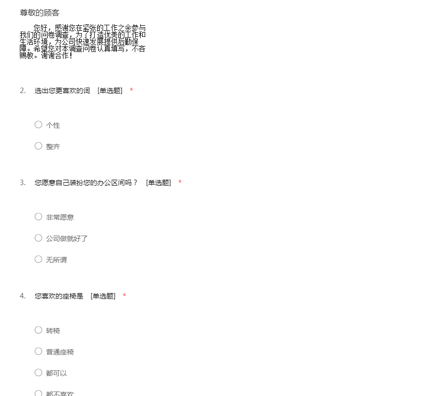 您好,感谢您在紧张的工作之余参与我们的问卷调查,为了打造优美的工作和生活环境,为公司快速发展提供后勤保障。希望您对本调查问卷认真填写,不吝赐教。谢谢合作!