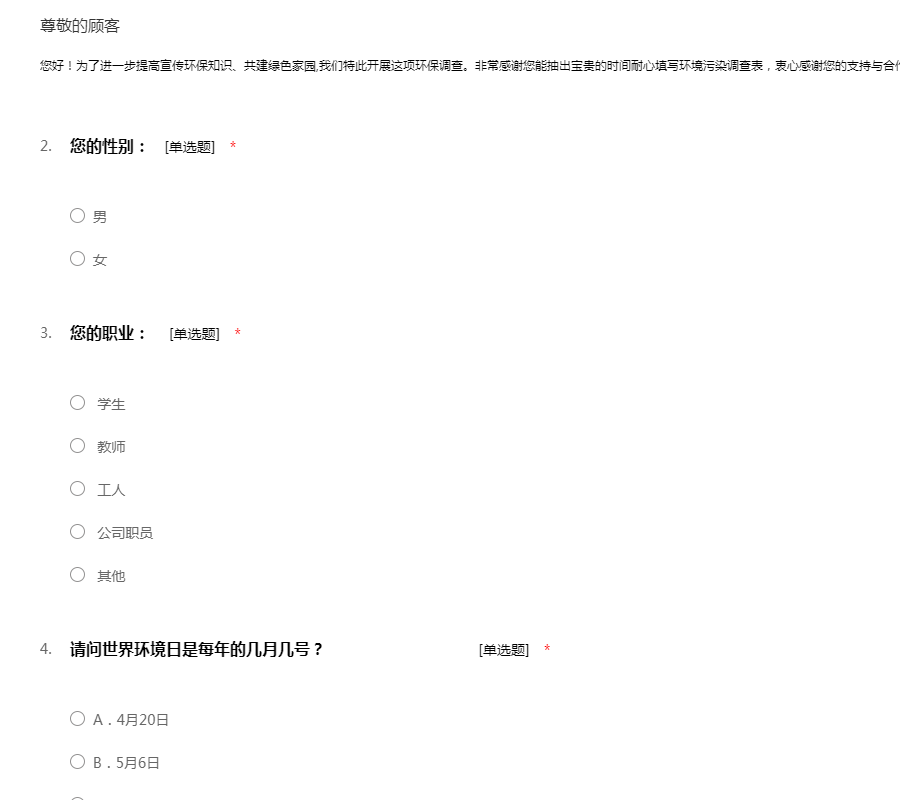 您好!近年来,国家大力改善生态环境,故本次开展了关于生态环境的调查问卷,感谢您在百忙之中抽空填写问卷!