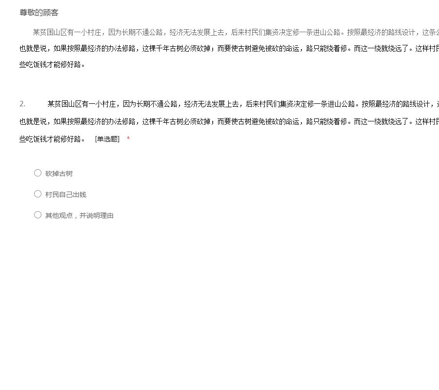 某贫困山区有一小村庄,因为长期不通公路,经济无法发展上去,后来村民们集资决定修一条进山公路。按照最经济的路线设计,这条公路经过的地方有一棵千年古树。 也就是说,如果按照最经济的办法修路,这棵千年古树必须砍掉;而要使古树避免被砍的命运,路只能绕着修。而这一绕就绕远了。这样村民们必须从原本就很瘪的腰包中再抠出一些吃饭钱才能修好路。